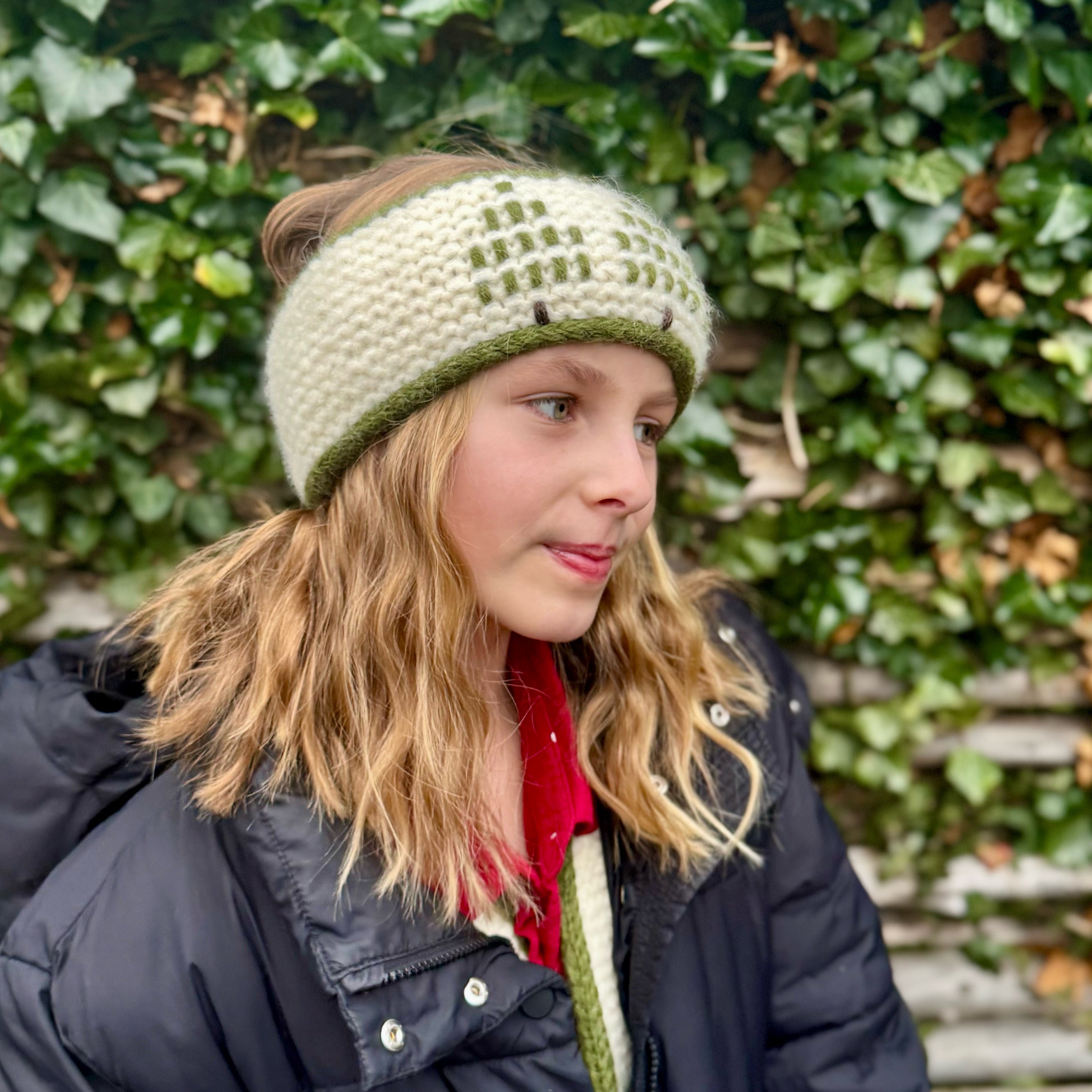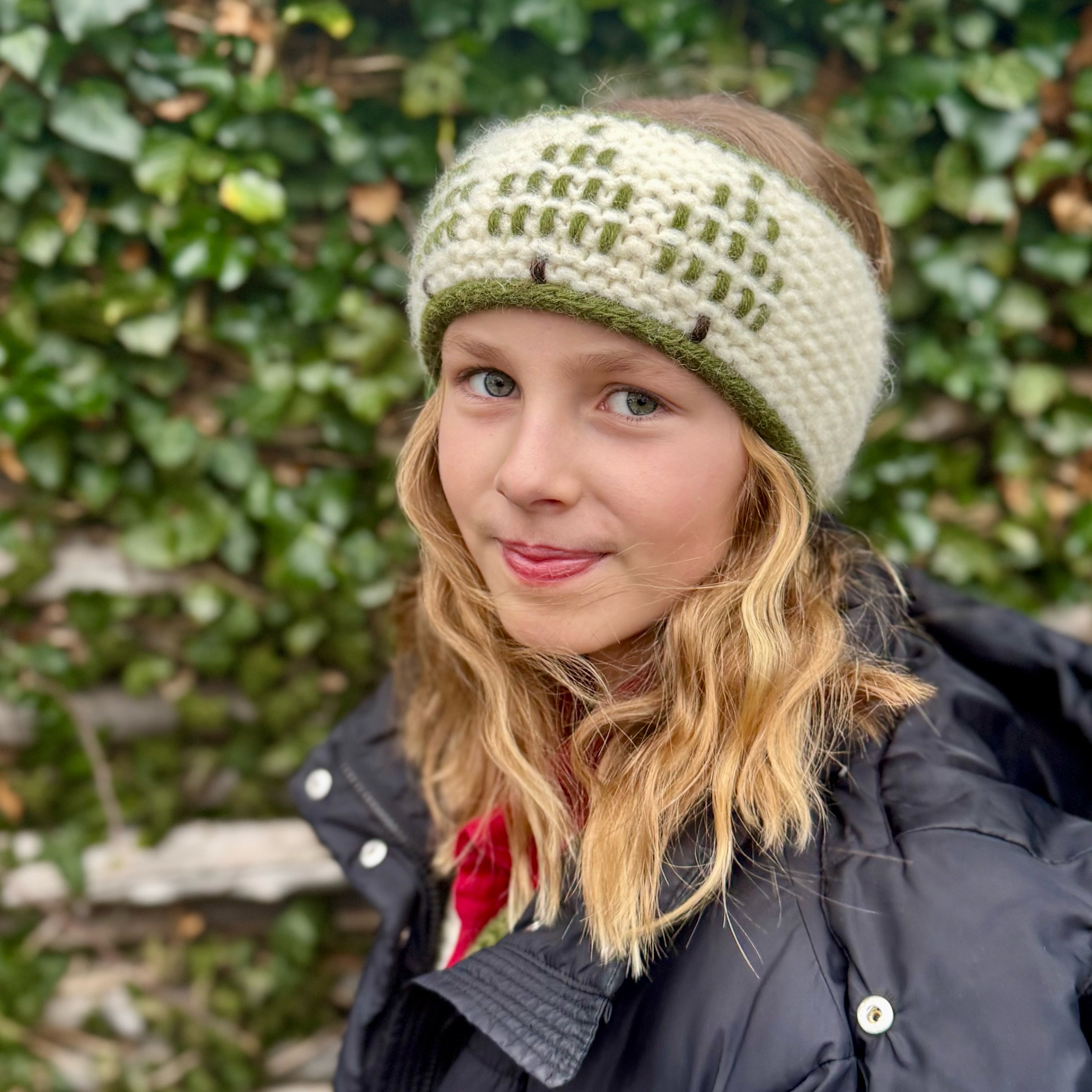 Selve pandebåndet strikkes frem og tilbage i retstrik i tre tråde børstet uld (kvalitet A), hvilket giver en tæt, varm og blød struktur, der holder formen godt ved brug. Den faste overflade skaber et roligt lærred til pyntestingene og gør pandebåndet både elastisk og komfortabelt at have på.