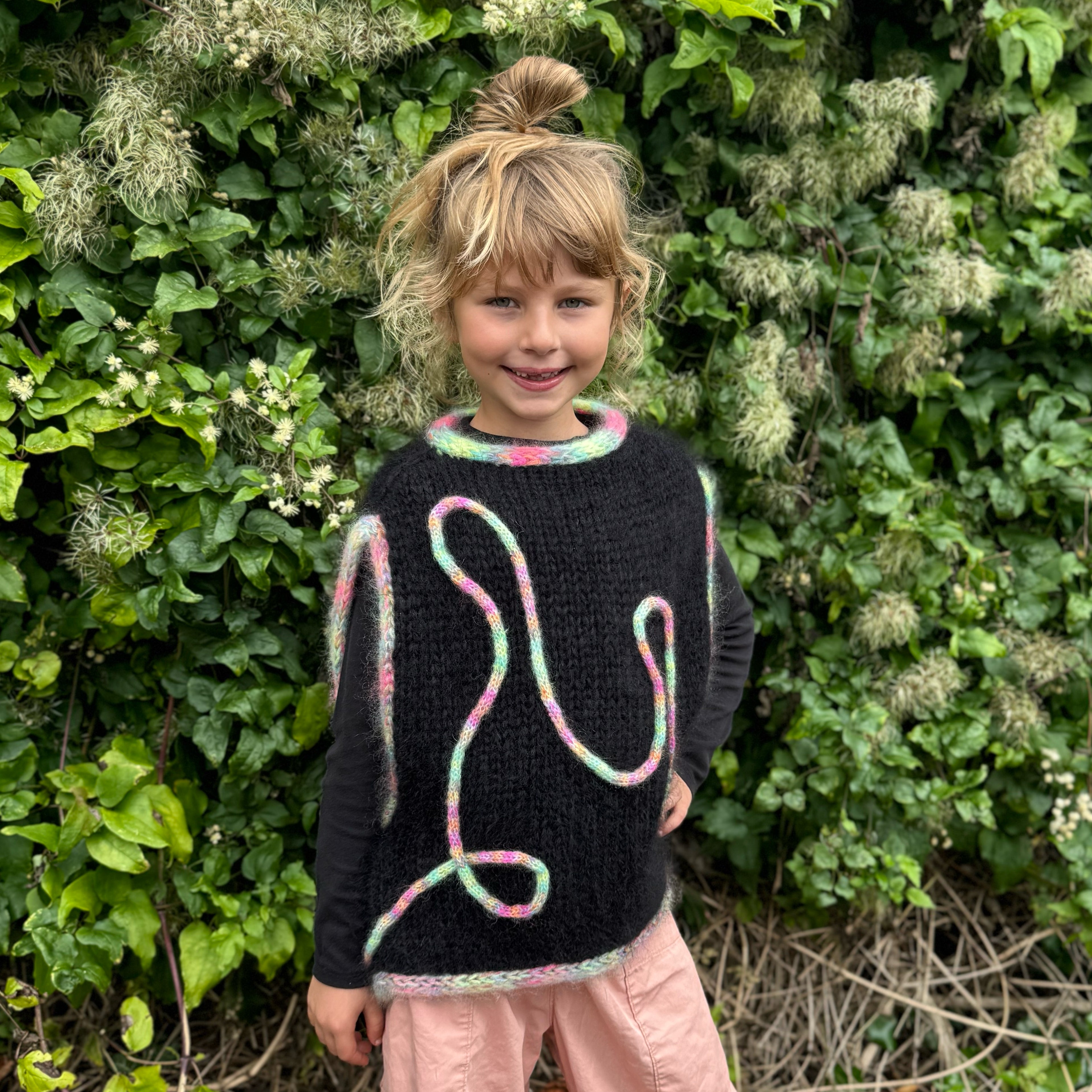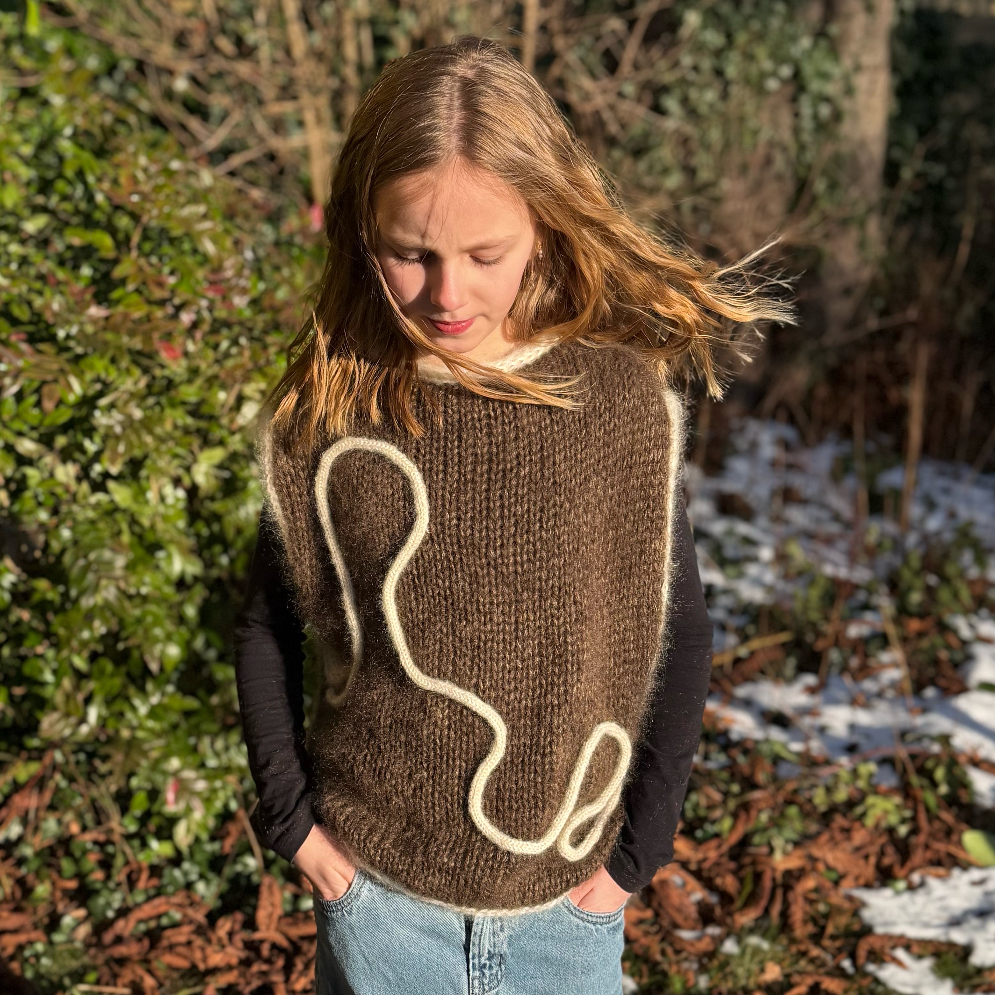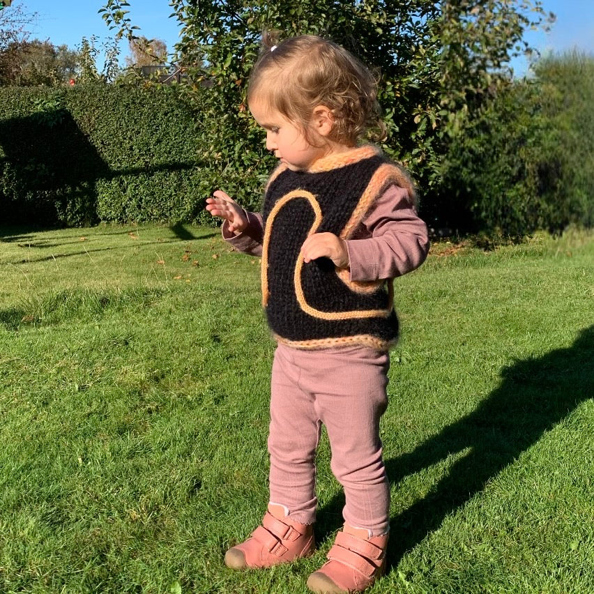 Vesten har en afslappet, let oversized pasform med dybe ærmeudskæringer, så der er masser af plads til både leg og vejrmøller. Designet er begyndervenligt og hurtigt at strikke på pind 10 mm.