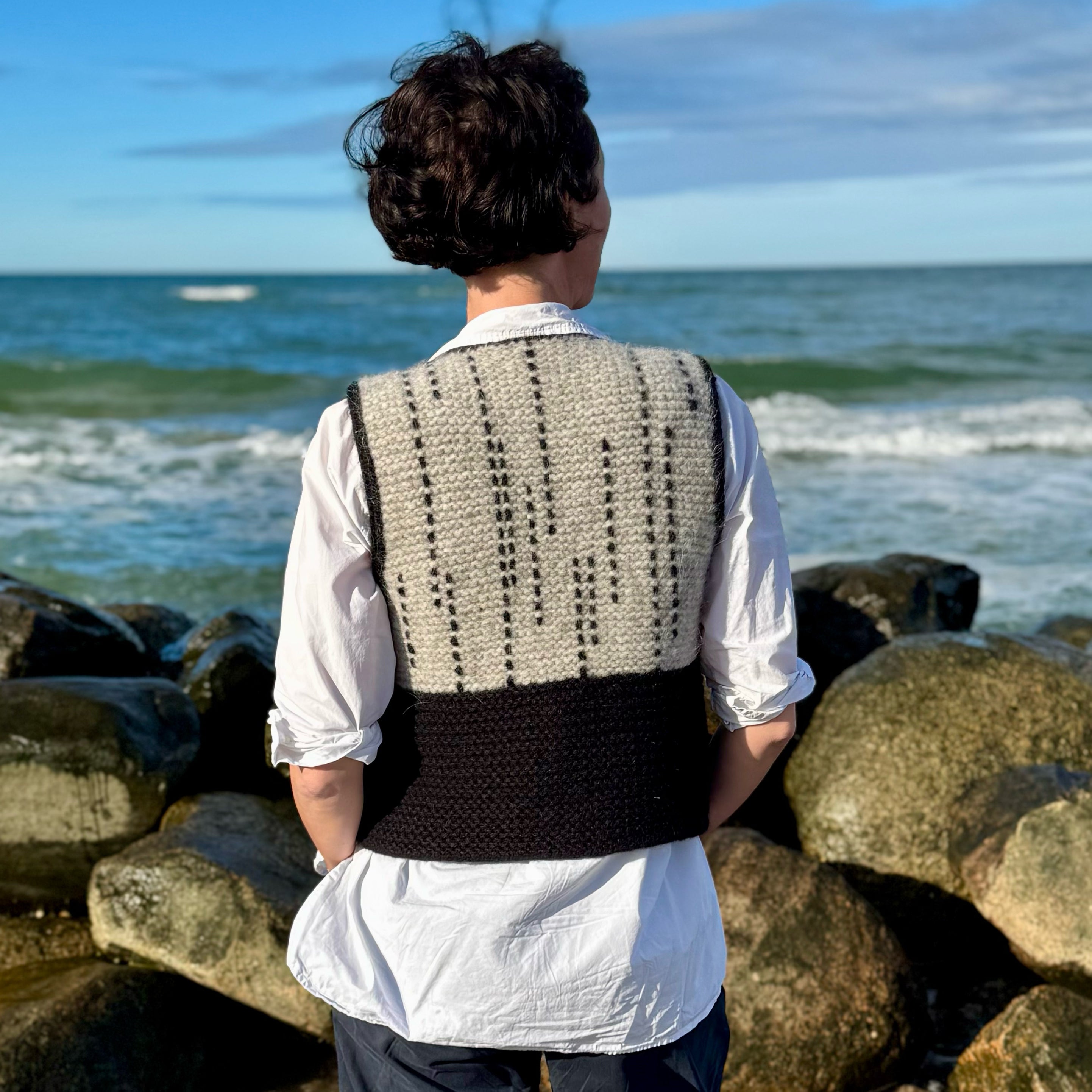 ‘Sashi Vest’ er et projekt, der kombinerer klassiske teknikker som åbent opslag, vendepinde og i-cordkanter med en enkel konstruktion og tydelig materialekontrast. Den strikkes i ét stykke uden montering og kan tilpasses i længde efter ønske.
