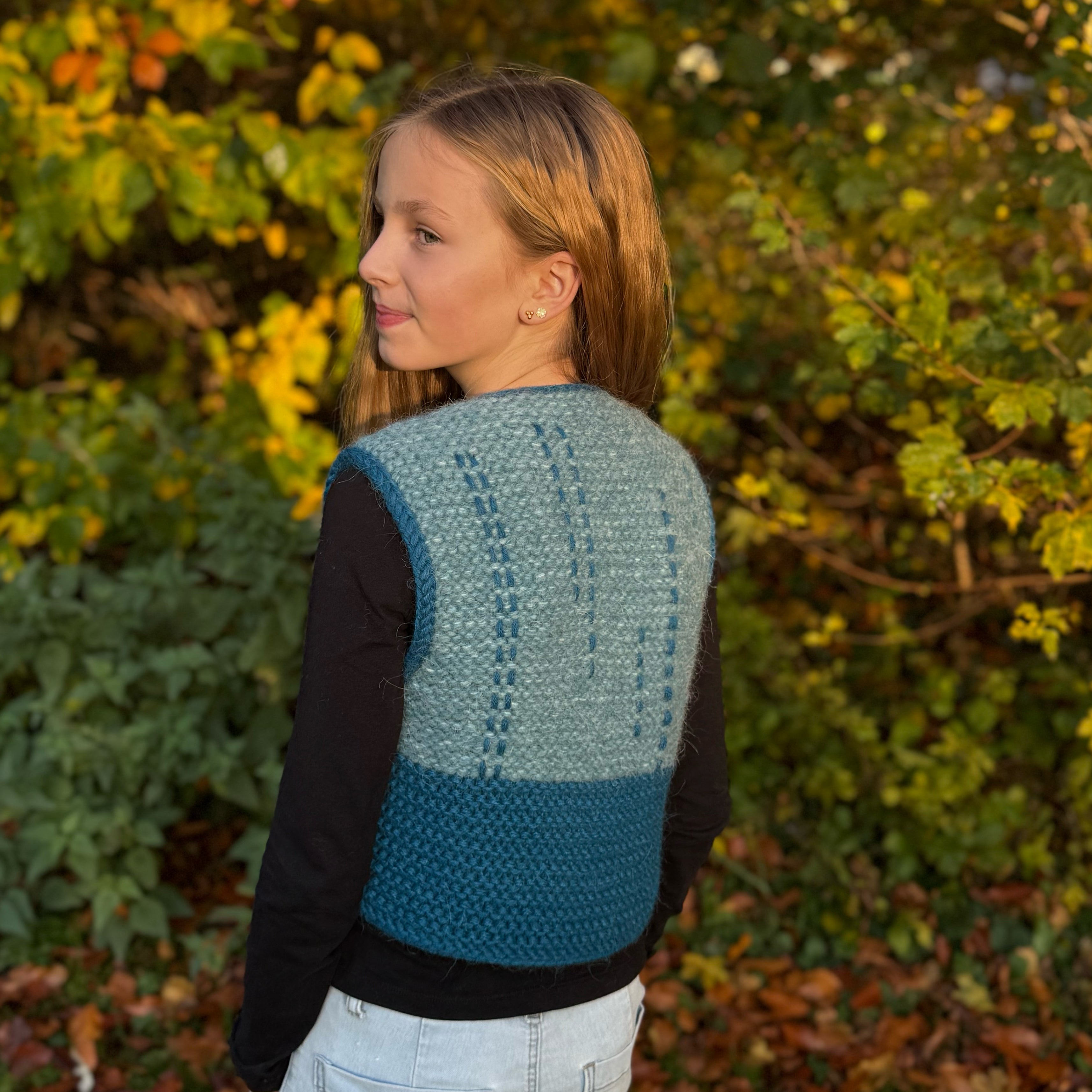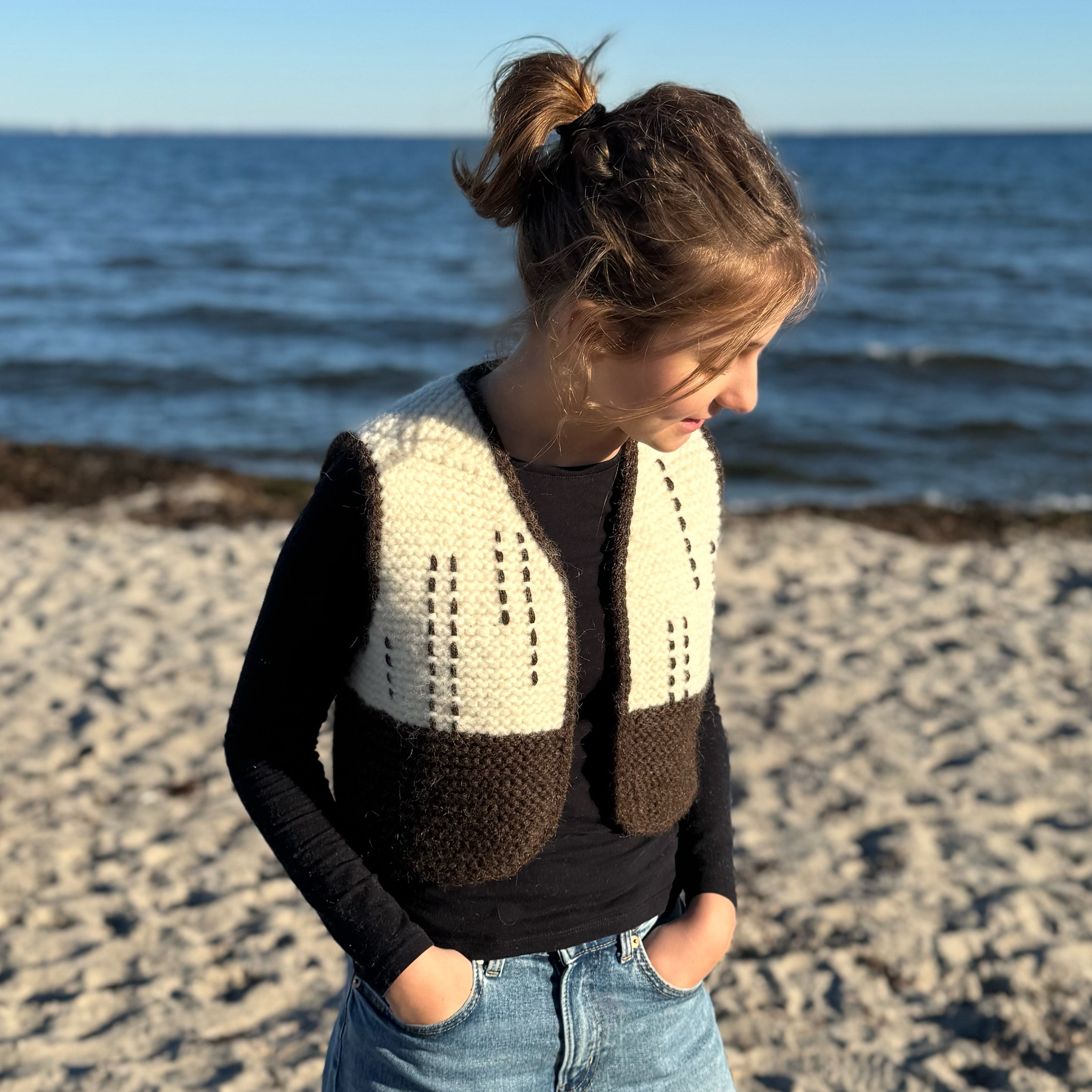 ‘Sashi Vest Junior’ er et projekt, der kombinerer klassiske teknikker som åbent opslag, vendepinde og i-cordkanter med en enkel konstruktion og tydelig materialekontrast. Den strikkes i ét stykke uden montering og kan tilpasses i længde efter ønske.